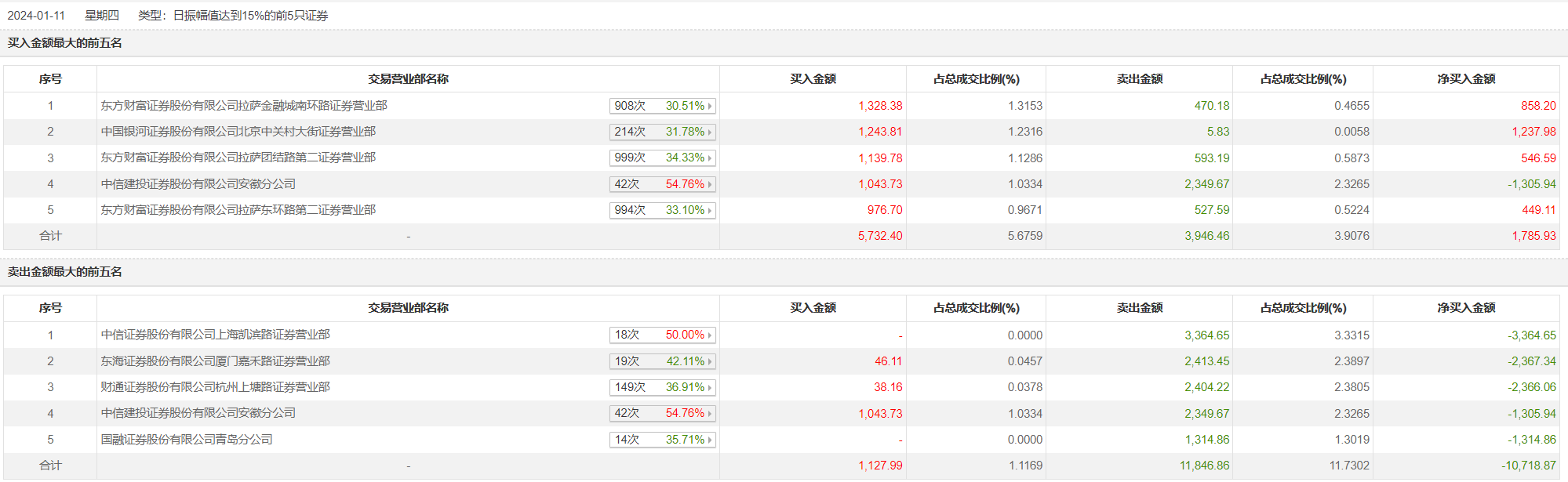 爱仕达1月11日跌停,全天换手率达26.06%,振幅达15%。龙虎榜数据显示,营业部席位合计净卖出7626.99万元。其中,中信证券上海凯滨路证券营业部、东海证券厦门嘉禾路证券营业部分别卖出3364.65万元、2413.45万元;东方财富证券拉萨金融城南环路证券营业部、中国银河证券北京中关村大街证券营业部分别买入1328.38万元、1243.81万元。
