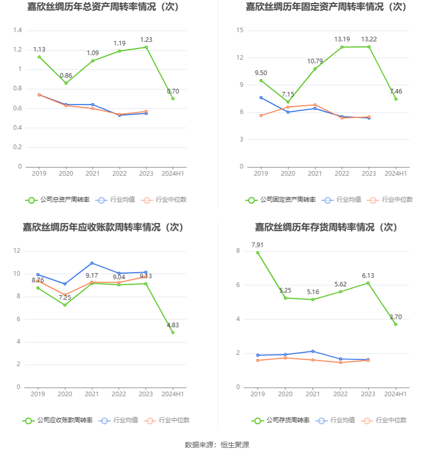 营运能力方面,2024年上半年,公司总资产周转率为0.70次,上年同期为0.63次(2023年上半年行业平均值为0.26次,公司位居同行业1/40);固定资产周转率为7.46次,上年同期为6.63次(2023年上半年行业平均值为2.51次,公司位居同行业5/40);公司应收账款周转率、存货周转率分别为4.83次、3.70次。