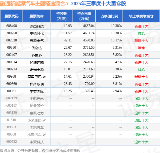 融通新能源汽车主题精选混合A的前十大重仓股如下: