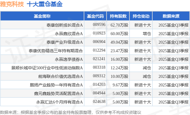 重仓雅克科技的前十大公募基金请见下表: