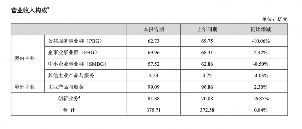 具体来看国内主业中的三大事业群的表现:2023年上半年,公共服务事业群(PBG)的营收同比减少10.06%至62.73亿元;中小企业事业群(SMBG)的营收同比减少8.50%至57.52亿元;相比之下,企事业事业群(EBG)的营收实现正向增长2.42%至69.96亿元。