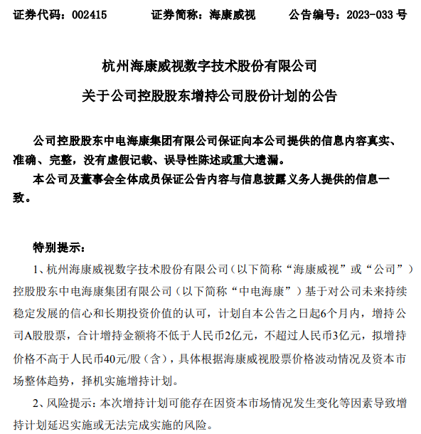 海康威视:控股股东拟2亿元-3亿元增持公司股份