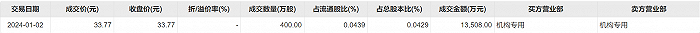今日大宗交易成交400万股,成交额1.35亿元,占当日总成交额的9.48%,成交价33.77元,较市场收盘价持平。