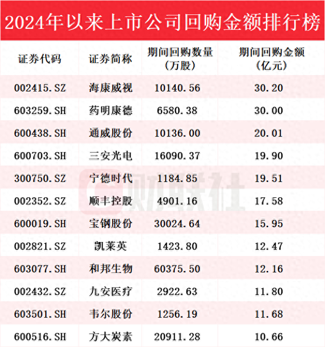 【年内近2200家A股公司实施股份回购 累计金额超1600亿元 海康威视、药明康德回购额均超30亿】财联社12月31日电,Wind数据显示,截至发稿,2024年以来,已有2156家上市公司实施股份回购,累计回购金额为1659.26亿元。从上市公司回购的金额来看,有12家公司回购金额超过10亿元。其中,海康威视回购额位居榜首,金额达30.2亿元;药明康德回购额为30亿元位列第二;通威股份回购额为20亿元位列第三;三安光电、宁德时代回购额均超19亿元。此外,顺丰控股、宝钢股份回购金额均超15亿元,凯莱英、和邦生物、九安医疗、韦尔股份和方大炭素回购额皆超10亿元。