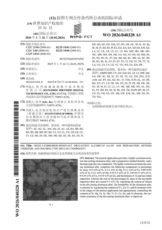 海康威视公布国际专利申请:“高耐腐蚀压铸铝合金及其制备方法和壳体类压铸零件”