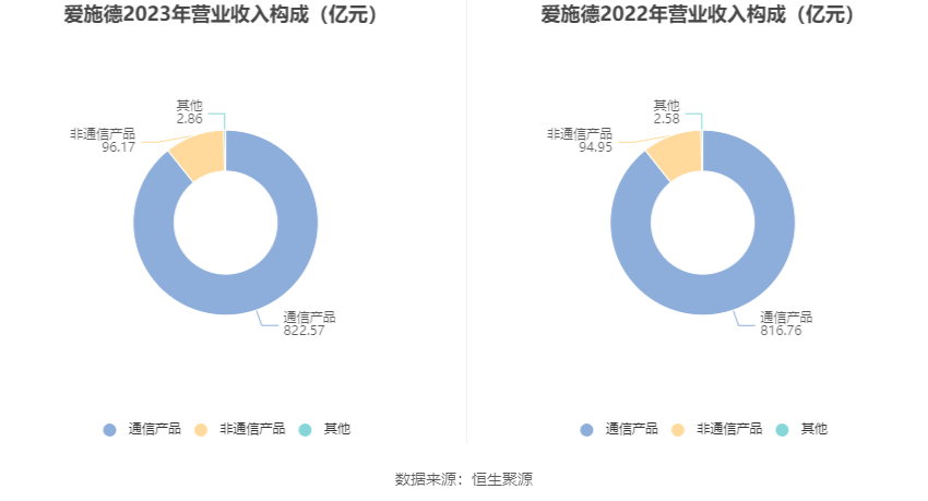 分产品来看,2023年公司主营业务中,通信产品收入822.57亿元,同比增长0.71%,占营业收入的89.25%;非通信产品收入96.17亿元,同比增长1.29%,占营业收入的10.43%。