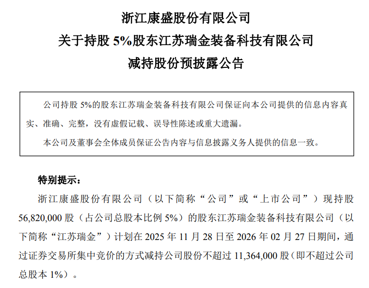 11月6日,康盛股份(002418.SZ)发布公告,持股5682万股(占公司总股本比例5%)的股东江苏瑞金装备科技有限公司(简称“江苏瑞金”)计划在2025年11月28日至2026年02月27日期间,通过证券交易所集中竞价的方式减持公司股份不超过1136.4万股(即不超过公司总股本1%)。
