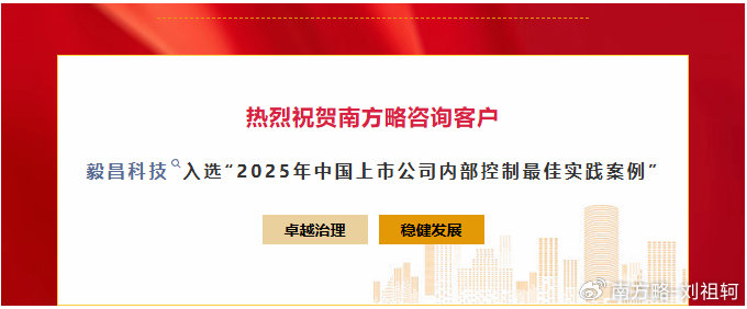 近日,中国上市公司协会正式公布“2025年中国上市公司内部控制最佳实践案例”评选结果。南方略咨询客户毅昌科技申报的内控实践案例凭借在经济活动特性与风险识别的精准性、内控机制的创新性及内控实施的实效性等方面的卓越表现,成功入选“最佳实践案例”,荣获国家级权威认可!
