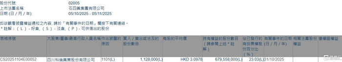 格隆汇11月5日丨根据联交所最新权益披露资料显示,2025年10月31日,石四药集团(02005.HK)获四川科伦药业股份有限公司在场内以每股均价3.0978港元增持112.8万股,涉资约349.43万港元。