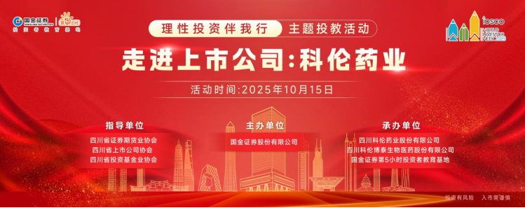 为进一步推动投资者与上市公司之间的沟通与交流,助力投资者更深入地了解上市公司的投资价值,积极弘扬理性投资理念,并切实履行保护投资者合法权益的主体责任,在四川省证券期货业协会、四川省上市公司协会、四川省投资基金业协会的指导下,由国金证券股份有限公司主办,四川科伦药业股份有限公司、四川科伦博泰生物医药股份有限公司、国金证券第5小时投教基地承办的“理性投资伴我行”主题投教活动——走进上市公司:科伦药业,于10月15日顺利举行。