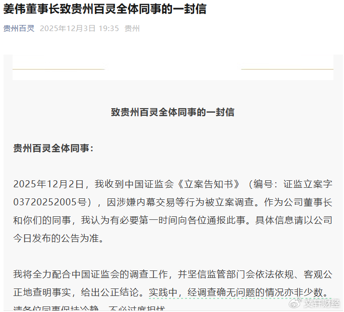 12月3日晚间,贵州百灵官微发布一则《姜伟董事长致贵州百灵全体同事的一封信》,信中,姜伟阐述:“2024年上半年,公司股票被ST处理;2025年公司完成摘帽,各方面发展重回正轨,我作为公司控股股东却又遭到华创证券无理巨额起诉;今天,我个人又受到中国证监会的立案调查。这一切都让我有一个强烈的感觉:似乎矛头开始转向了我个人。”