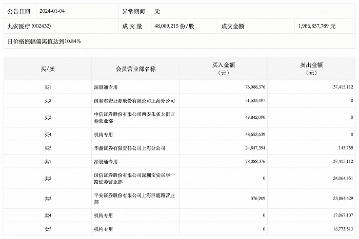 1月4日,九安医疗今日涨停,龙虎榜数据显示,上榜营业部席位全天成交3.73亿元,占当日总成交金额比例为18.76%。其中,买入金额为2.53亿元,卖出金额为1.19亿元,合计净买入1.34亿元。