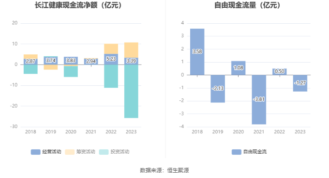 2023年,公司经营活动现金流净额为3.39亿元,同比下降35.23%;筹资活动现金流净额7.35亿元,同比增加2.47亿元;投资活动现金流净额-25.77亿元,上年同期为-11.15亿元。