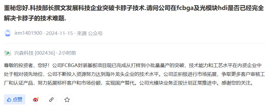 兴森科技(002436)在互动平台上表示,公司FCBGA封装基板项目现已完成从打样到小批量量产的突破,技术能力和工艺水平在内资企业中处于相对领先地位,公司不断投入资源努力达到海外龙头企业的技术水平。公司正积极进行市场拓展,争取更多客户审核工厂和认证产品,努力拓展标杆客户和市场份额,实现国产替代。公司光模块业务正按计划正常推进中。