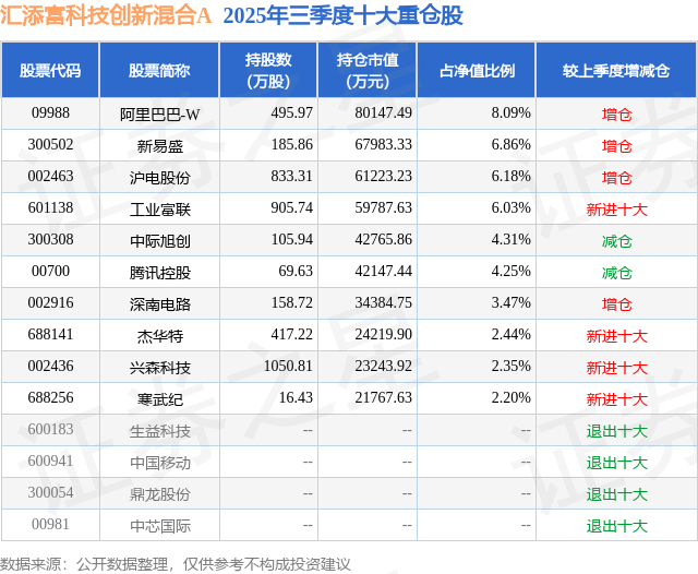 汇添富科技创新混合A的前十大重仓股如下:
