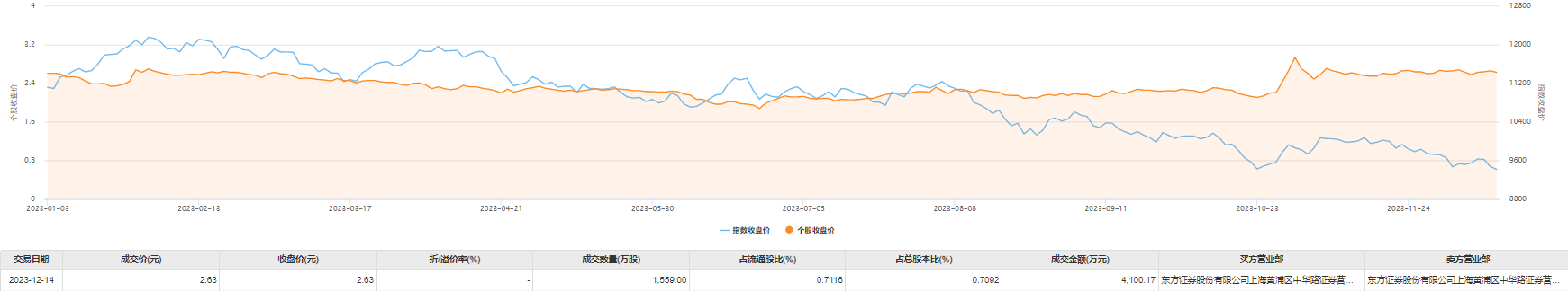 今日大宗交易成交1559万股,成交额4100.17万元,占当日总成交额的22.21%,成交价2.63元,较市场收盘价持平。