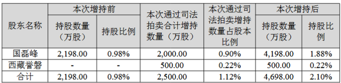 2025年11月21日,经查询,公司董事、总经理、财务负责人国磊峰及其一致行动人西藏誉磐企业管理合伙企业(有限合伙)参与该司法拍卖,取得了合计2500万股,占公司总股本的1.12%。本次增持情况如下: