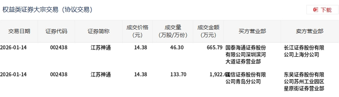 1月14日,江苏神通大宗交易成交180万股,成交额2588.4万元,占当日总成交额的6.22%,成交价14.38元,较市场收盘价15.82元折价9.1%。