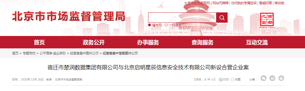 宿迁市楚润数据集团有限公司与北京启明星辰信息安全技术有限公司新设合营企业案