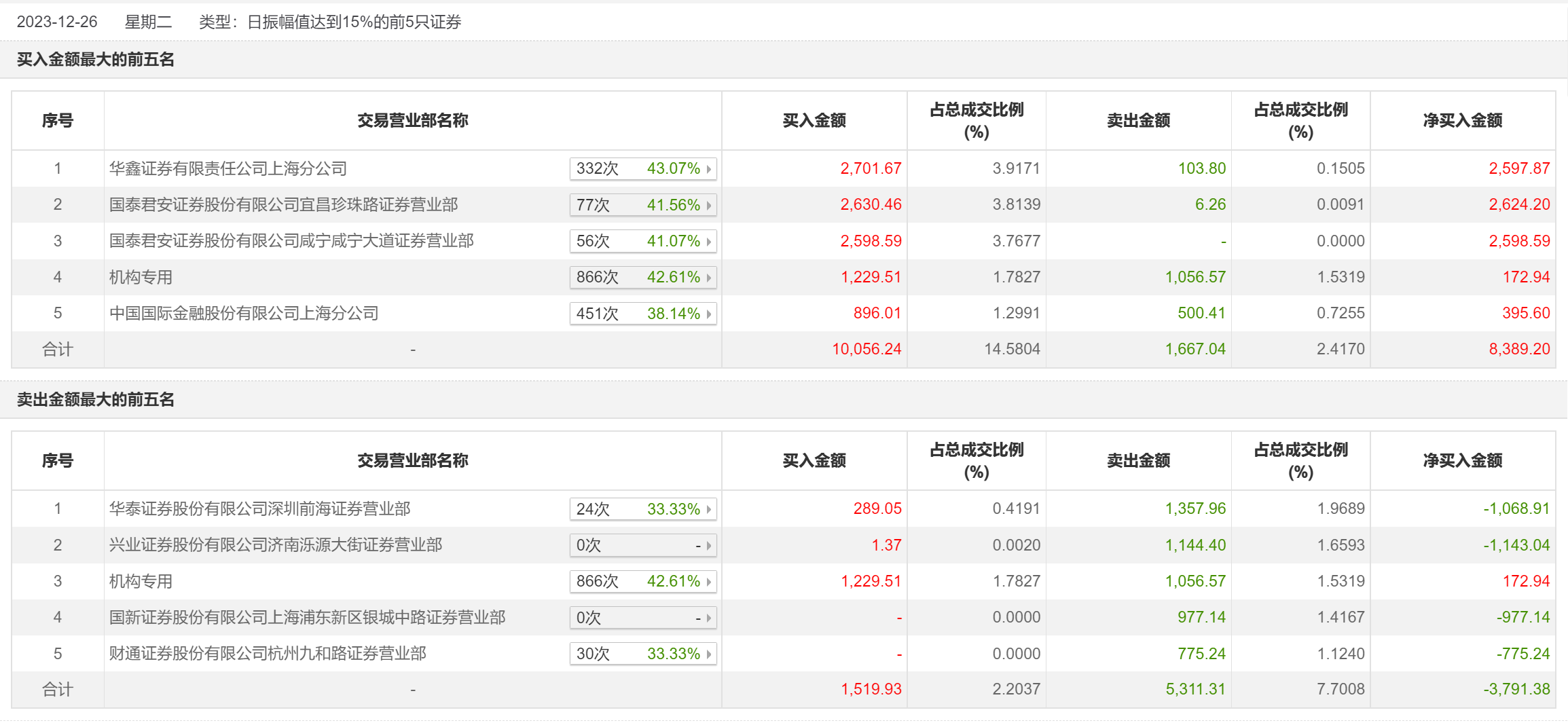 12月26日,龙星化工今日涨停,全天换手率达22.33%,振幅达16.31%。龙虎榜数据显示,营业部席位合计净买入4424.88万元。其中,机构买入1229.51万元,卖出1056.57万元,合计净买入172.94万元。此外,华鑫证券上海分公司、国泰君安证券宜昌珍珠路证券营业部分别买入2701.67万元、2630.46万元;华泰证券深圳前海证券营业部、兴业证券济南泺源大街证券营业部分别卖出1357.96万元、1144.40万元。