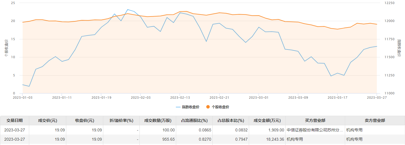 今日大宗交易成交1055.65万股,成交额2.02亿元,占当日总成交额的40.79%,成交价19.09元,较市场收盘价持平。