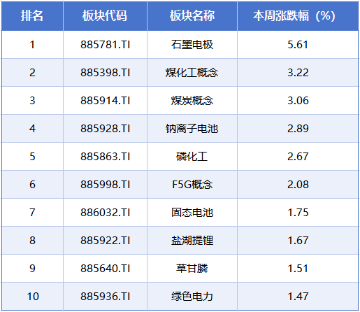 板块方面,本周涨幅居前的概念板块分别是石墨电极、煤化工概念、煤炭概念、钠离子电池、磷化工,累计涨幅分别为5.61%、3.22%、3.06%、2.89%、2.67%。