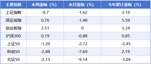 本周(3月9日至3月13日),A股三大指数涨跌互现。截至周五收盘,上证指数累计下跌0.7%,深证成指累计上涨0.76%,创业板指累计上涨2.51%。