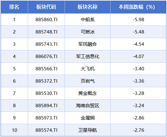 本周排在跌幅榜前排的概念板块分别是中船系、可燃冰、军民融合、军工信息化、大飞机,累计跌幅分别为5.98%、5.48%、4.54%、4.07%、3.40%。