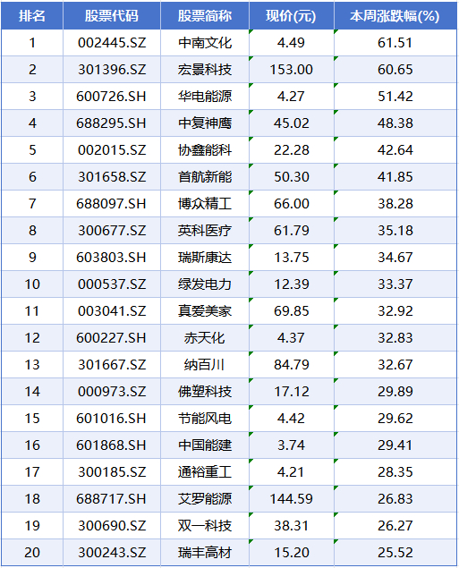 个股方面,本周个股涨幅榜前五位分别是中南文化、宏景科技、华电能源、中复神鹰、协鑫能科,累计涨幅分别为61.51%、60.65%、51.42%、48.38%、42.64%。