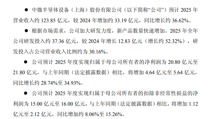 中微公司预计2025年度营业收入约123.85 亿元,较 2024 年增加约 33.19 亿元,同比增长约36.62%;净利润为20.80 亿元至21.80 亿元,与上年同期(法定披露数据)相比,同比增长约 28.74%至 34.93%;扣非净利润约为15.00 亿元至 16.00 亿元,同比增加约 8.06%至 15.26%。