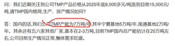 百川股份公司表示,国内TMP总产能约20万吨,百川高科现有产能7万吨/年(宁夏基地5万吨/年、南通基地2万吨/年),为行业主要参与者之一。