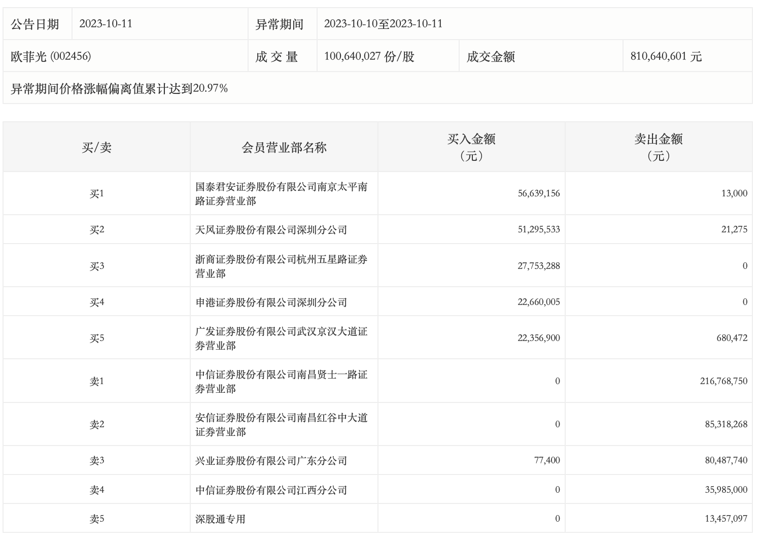 10月11日,欧菲光今日涨停,全天换手率达1.27%,振幅达0%。龙虎榜数据显示,10月10日至10月11日期间,上榜营业部席位合计净卖出2.52亿元。其中,作手新一(国泰君安证券南京太平南路证券营业部)、天风证券深圳分公司分别买入5663.92万元、5129.55万元;中信证券南昌贤士一路证券营业部、安信证券南昌红谷中大道证券营业部分别卖出2.17亿元、8531.83万元。