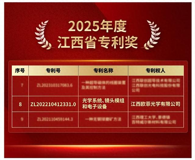 近日,2025年度江西省省长质量奖和专利奖评选结果正式揭晓。欧菲光集团旗下江西欧菲光学有限公司凭借一项核心技术专利,成功获得江西省专利奖。