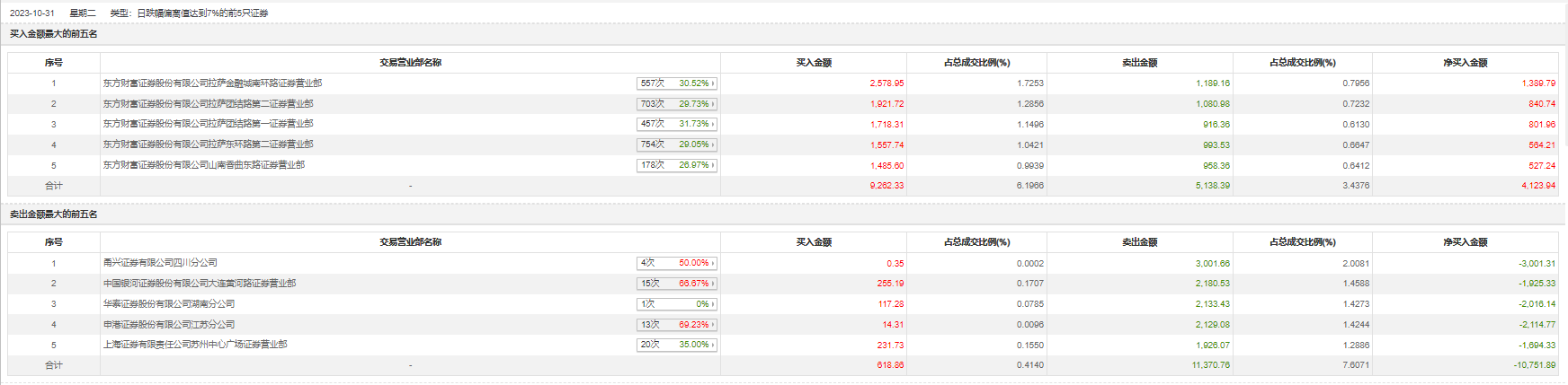 10月31日,青龙管业今日跌停,全天换手率达37.83%,振幅达8.84%。龙虎榜数据显示,营业部席位合计净卖出6627.95万元。其中,甬兴证券有限公司四川分公司、中国银河证券大连黄河路证券营业部分别卖出3001.66万元、2180.53万元;东方财富证券拉萨金融城南环路证券营业部、东方财富证券拉萨团结路第二证券营业部分别买入2578.95万元、1921.72万元。