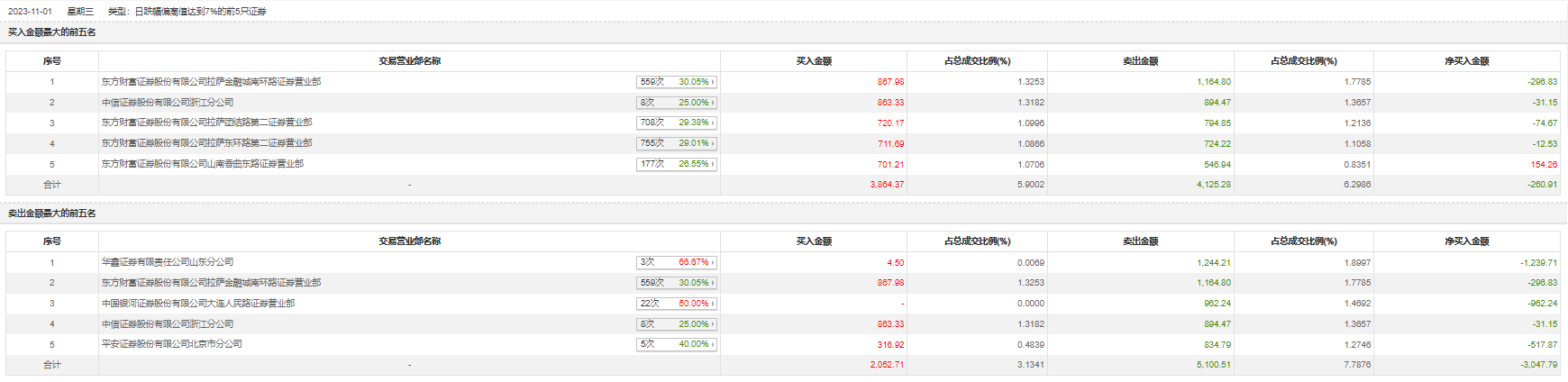 11月1日,青龙管业今日跌停,全天换手率达18.72%,振幅达4.26%。龙虎榜数据显示,营业部席位合计净卖出2980.73万元。其中,华鑫证券山东分公司、东方财富证券拉萨金融城南环路证券营业部分别卖出1244.21万元、1164.80万元;东方财富证券拉萨金融城南环路证券营业部、中信证券浙江分公司分别买入867.98万元、863.33万元。