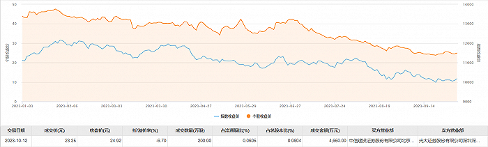 10月12日大宗交易成交200万股,成交额4650万元,占当日总成交额的4.69%,成交价23.25元,较市场收盘价折价6.7%。