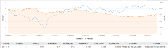 5月30日大宗交易成交672.33万股,成交额9500.02万元,占当日总成交额的3.99%,成交价14.13元,较市场收盘价15.73元折价10.17%。