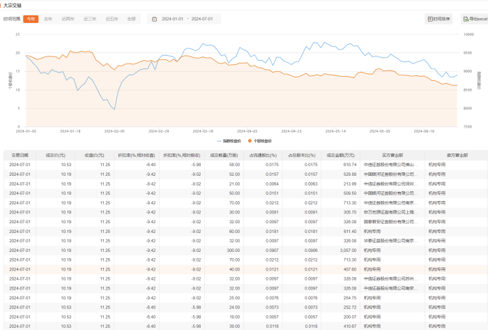 今日大宗交易成交986万股,成交额1.01亿元,占当日总成交额的19.04%,成交均价10.24元,较市场收盘价折价8.98%,其中最高成交价10.53元,最低成交价10.19元。