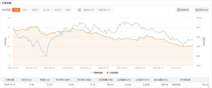 今日大宗交易成交100万股,成交额949万元,占当日总成交额的1.55%,成交价9.49元,较市场收盘价折价8.04%。
