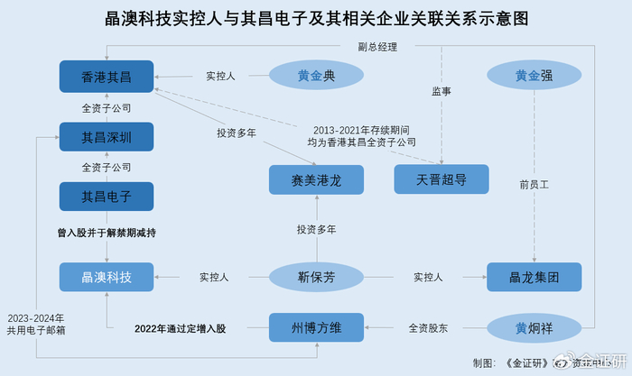 值得注意的是,2018-2024年晶澳科技子公司晶澳太阳能,与黄金典控制的香港其昌曾共同投资晶兴电子。而香港其昌实控人黄金典,与靳保芳控制企业的前员工“黄金强”姓名相仿。不仅如此,晶澳科技曾向黄金典名下的其昌电子发行股份,其昌电子所持股份自解禁起即开始减持。上述“关系网”的另一面,香港其昌员工控制的州博方维2022年通过定增入股晶澳科技,且州博方维与香港其昌子公司上演经营混淆异象,或关系待解。