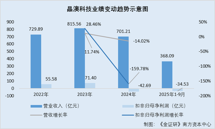 据晶澳科技2024年报及2025年三季报,2022-2024年及2025年1-9月,晶澳科技营业收入分别为729.89亿元、815.56亿元、701.21亿元、368.09亿元。2023-2024年及2025年1-9月,晶澳科技营业收入的同比增长率分别为11.74%、-14.02%、-32.27%。