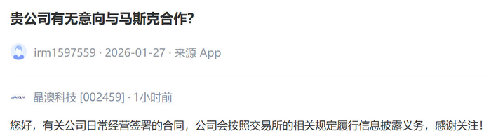 中新经纬2月4日电 4日,针对投资者“贵公司有无意向与马斯克合作”的提问,晶澳科技在互动平台回复称,有关公司日常经营签署的合同,公司会按照交易所的相关规定履行信息披露义务。