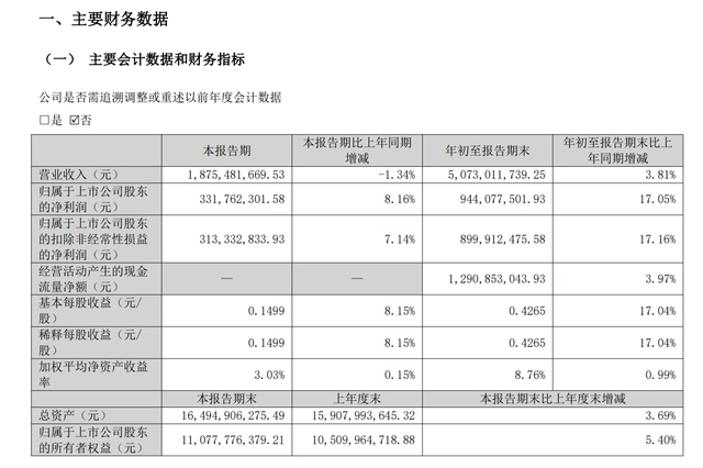 其中,第三季度公司实现营业收入18.75亿元,同比下降1.34%;归母净利润3.32亿元,同比增长8.16%;扣非归母净利润3.13亿元,同比增长7.14%。