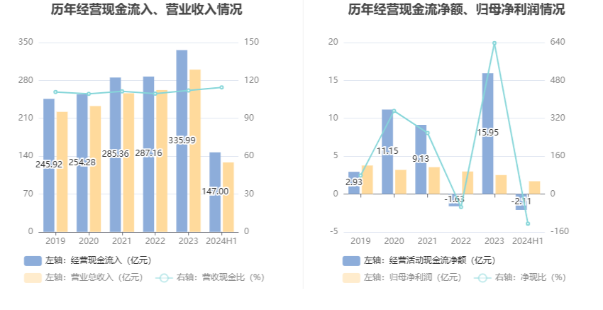 2024年上半年,公司营业收入现金比为114.49%,净现比为-125.63%。