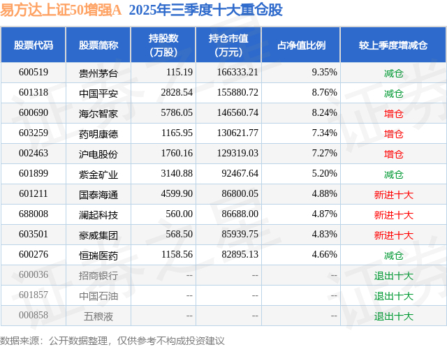 根据2025基金Q3季报公募基金重仓股数据,重仓该股的公募基金共345家,其中持有数量最多的公募基金为易方达基金的易方达上证50增强A。易方达上证50增强A目前规模为162.55亿元,最新净值2.1705(1月13日),较上一交易日上涨0.41%,近一年上涨28.43%。该公募基金现任基金经理为张胜记。张胜记在任的基金产品包括:易方达沪深300指数增强A,管理时间为2020年12月30日至今,期间收益率为4.08%;易方达金融行业股票发起式A,管理时间为2024年3月2日至今,期间收益率为71.56%;易方达上证50增强策略ETF,管理时间为2024年5月27日至今,期间收益率为28.83%。
