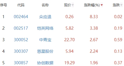 其中,众应退、恺英网络、中青宝、慈星股份、协创数据位列板块涨幅前五位,涨幅分别为8.33%、3.38%、2.67%、2.24%、1.96%。