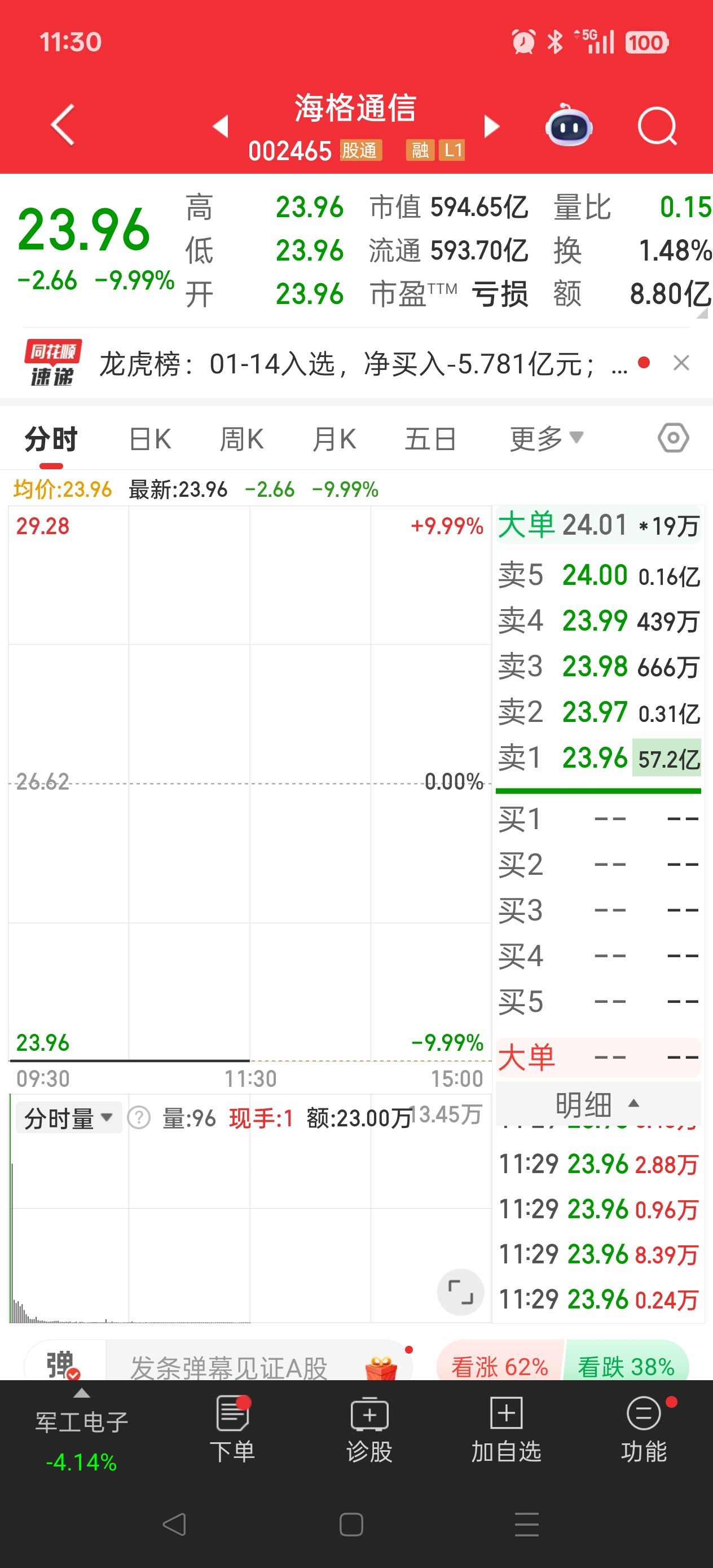 170亿资金被套 海格通信三连板后一字跌停