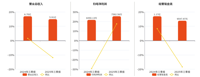 公司营业总收入为5.91亿元,在已披露的同业公司中排名第27,较去年同报告期营业总收入减少7950.88万元,同比较去年同期下降11.86%。归母净利润为7582.56万元。经营活动现金净流入为9547.97万元,较去年同报告期经营活动现金净流入减少2149.27万元,同比较去年同期下降18.37%。