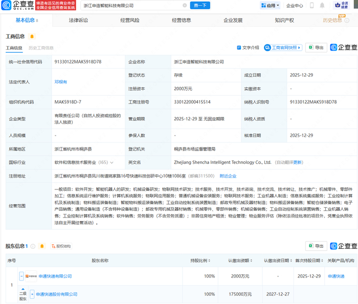 企查查APP显示,近日,浙江申造智能科技有限公司成立,法定代表人为邓根有,注册资本为2000万元,经营范围包含:智能机器人的研发;物联网技术研发;机械零件、零部件加工;工业机器人制造;智能仓储装备销售等。企查查股权穿透显示,该公司由申通快递(002468)间接全资持股。