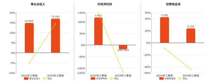 公司营业总收入为73.19亿元,在已披露的同业公司中排名第17,较去年同报告期营业总收入增加9.23亿元,同比较去年同期上涨14.44%。归母净利润为-2947.64万元,在已披露的同业公司中排名第50,较去年同报告期归母净利润减少2.10亿元,同比较去年同期下降116.36%。经营活动现金净流入为2.12亿元,在已披露的同业公司中排名第27,较去年同报告期经营活动现金净流入减少1.66亿元,同比较去年同期下降44.00%。